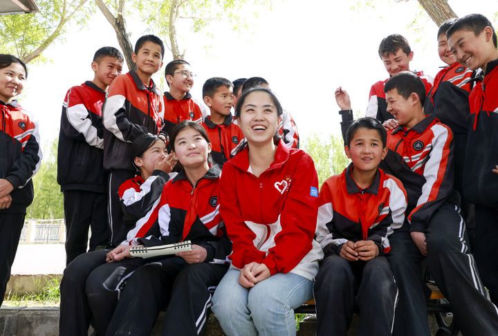 在新疆阿圖什市哈拉峻鄉謝依特小學,支教教師高淑賢和學生們在一起(2025年4月23日攝)。新華社記者 王菲 攝