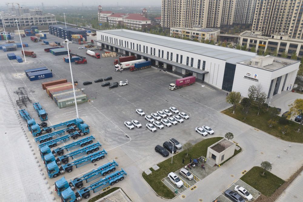 西安國際港站運行中的哈薩克斯坦西安碼頭(2025年11月14日攝,無人機照片)。新華社記者 邵瑞 攝