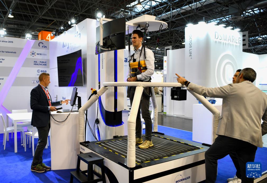 11月17日,一名參觀者在德國(guó)杜塞爾多夫國(guó)際醫(yī)療器械設(shè)備展上體驗(yàn)康復(fù)設(shè)備。