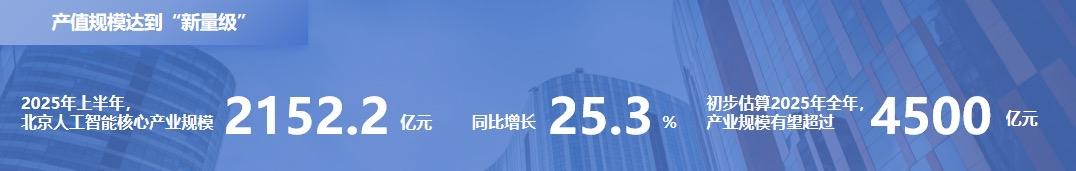 具體來看,能級躍升,跑出產業高質量發展的“北京速度”:產業規模量質齊升。數據顯示,截至目前,人工智能核心產業規模持續增長,2025年上半年,全市人工智能核心產業規模2152.2億元,同比增長25.3%。初步估算2025年全年,產業規模有望超過4500億元。AI企業超2500家,已備案大模型183款,持續保持全國第一。產業鏈日趨完整,形成了具有全球競爭力的產業生態。同時,商業化路徑也逐漸清晰,百度、抖音等公司的營收和產品活躍用戶數均創新高。北京正以前所未有的速度,持續建設“人工智能第一城”。