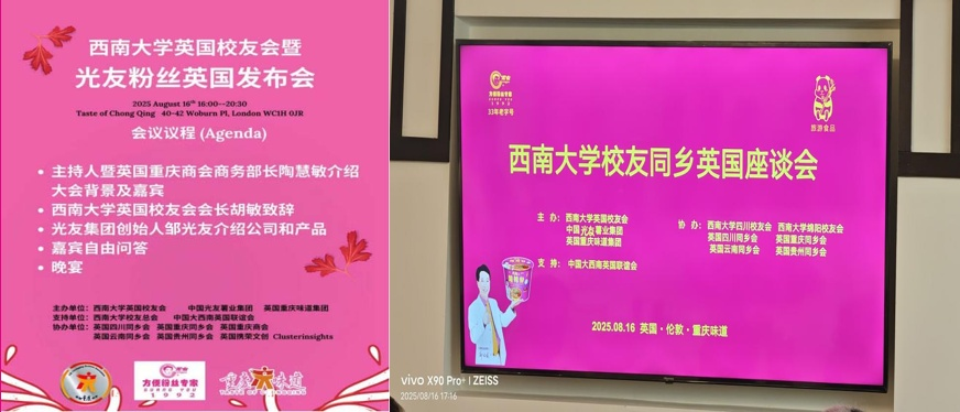 8月16日,光友粉絲團在倫敦重慶味道召開《西南大學英國校友會暨光友粉絲英國發布會》,來自中英兩國的西南大學校友及川渝云貴等企業家、科學家歡聚一堂,共敘鄉情、推動光友粉絲在英國大發展。
