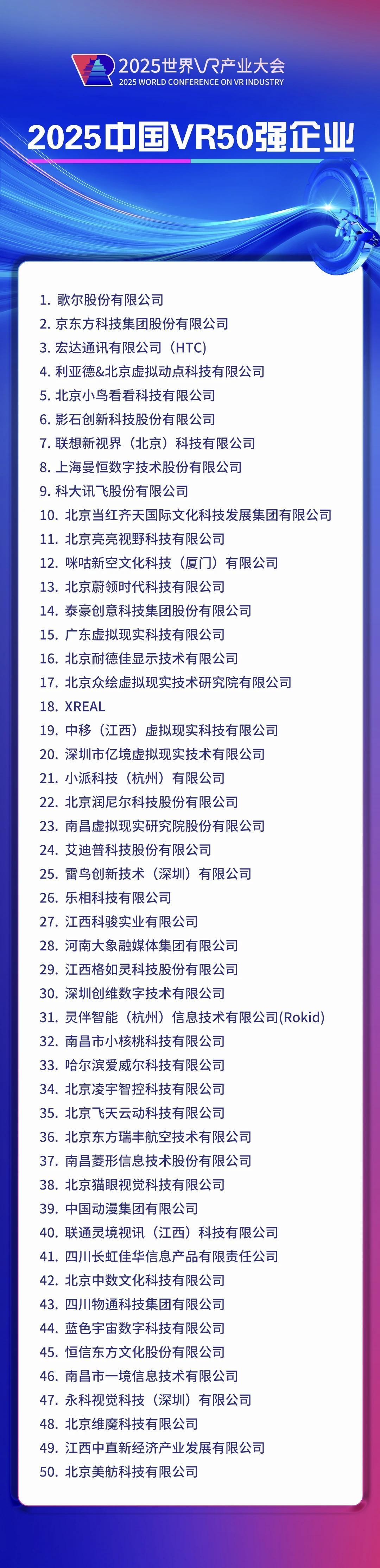 10月19日,“2025中國VR50強企業”名單正式發布,這是“中國VR50強企業”名單連續第七年發布。