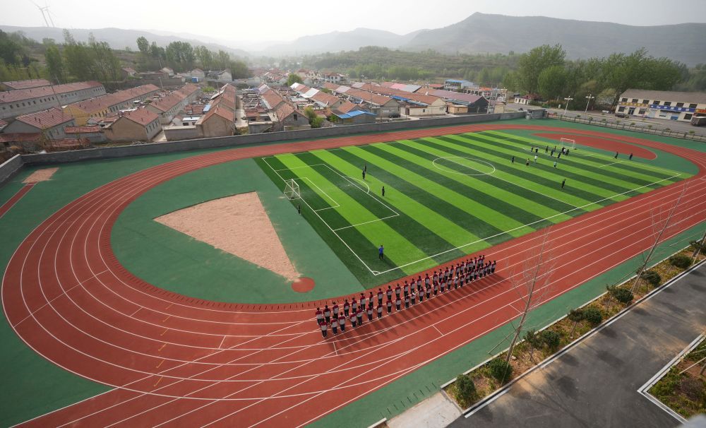 在位于山東濰坊市臨朐縣石家河村的臨朐縣彌水教育集團(tuán)石家河校區(qū),學(xué)生在操場(chǎng)塑膠跑道上進(jìn)行體育鍛煉(2025年4月17日攝)。新華社記者 徐速繪 攝