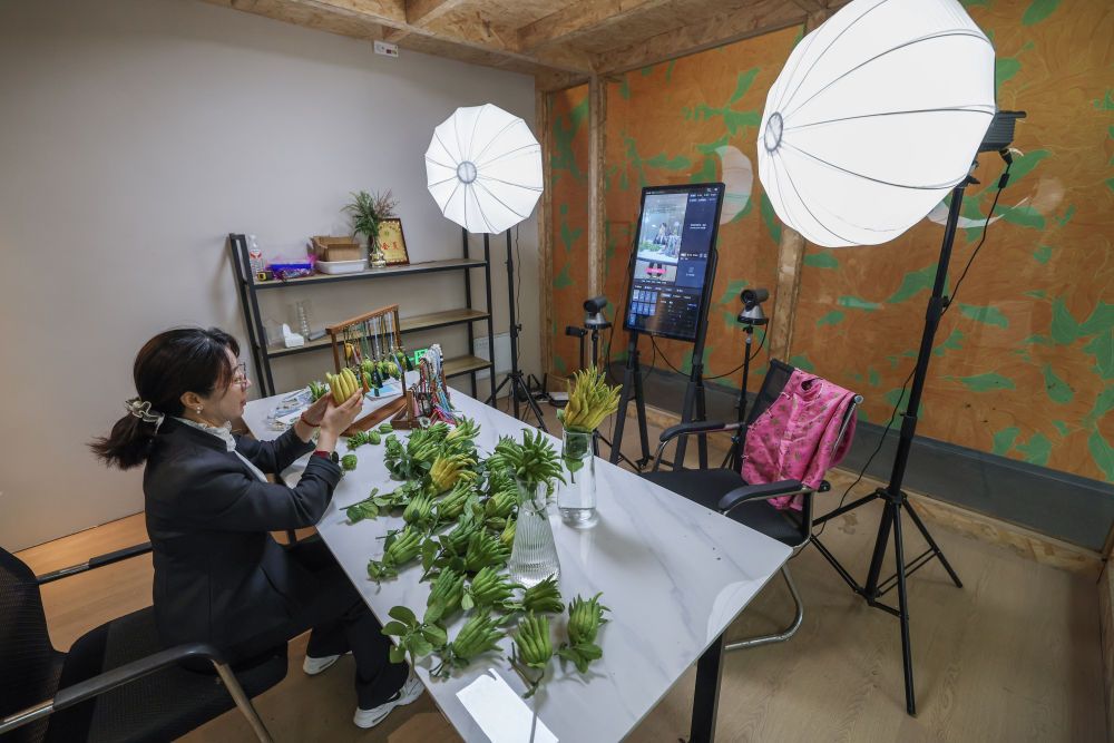 在浙江金華市金東區(qū)赤松鎮(zhèn)北山口村的金華佛手農(nóng)林服務(wù)中心內(nèi)的直播間,工作人員進(jìn)行佛手鮮果及衍生產(chǎn)品的直播銷售(2025年10月22日攝)。新華社記者 徐昱 攝