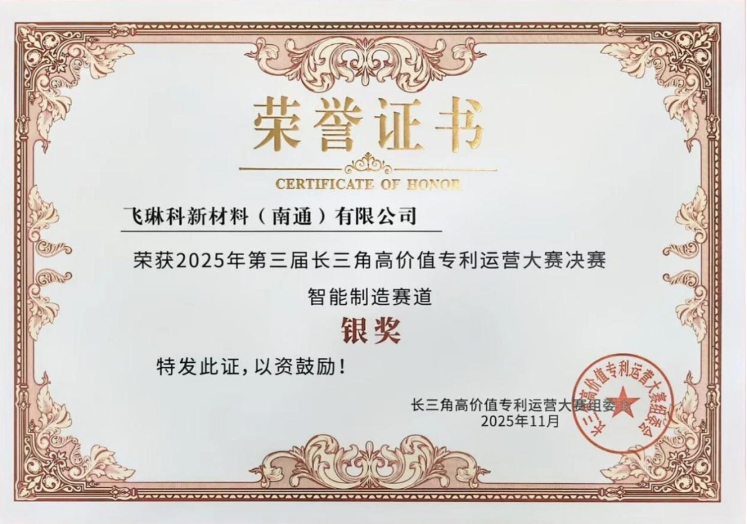 此次獲獎的兩大賽事均為行業內極具影響力的創新成果展示與實力比拼平臺:中國創新創業大賽匯聚了全國37個地方賽區197個新材料領域優秀項目,飛琳科以市賽第一、省賽二等獎的優異成績脫穎而出,充分彰顯了其技術創新性與市場應用前景;長三角高價值專利運營大賽及沿滬寧產業創新帶高價值專利運營大賽則聚焦優質專利轉化,飛琳科憑借完整的專利布局、突出的技術創新力及成熟的運營轉化能力斬獲重要獎項,印證了高新區企業在知識產權保護與成果轉化方面的扎實成效。