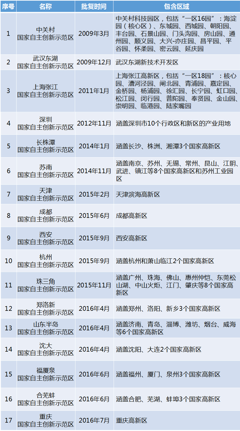 國家自主創(chuàng)新示范區(qū)是經(jīng)國務(wù)院批準(zhǔn),在推進(jìn)自主創(chuàng)新和高新技術(shù)產(chǎn)業(yè)發(fā)展方面先行先試、探索創(chuàng)新經(jīng)驗(yàn)、做出示范的區(qū)域,是新時(shí)期我國實(shí)施創(chuàng)新驅(qū)動(dòng)發(fā)展戰(zhàn)略的重大舉措。自2009年3月中關(guān)村國家自創(chuàng)區(qū)成立以來,至今國務(wù)院已批復(fù)成立了17家國家自創(chuàng)區(qū),涉及47家國家高新區(qū),形成了以國家高新區(qū)為主要發(fā)展載體的構(gòu)架。