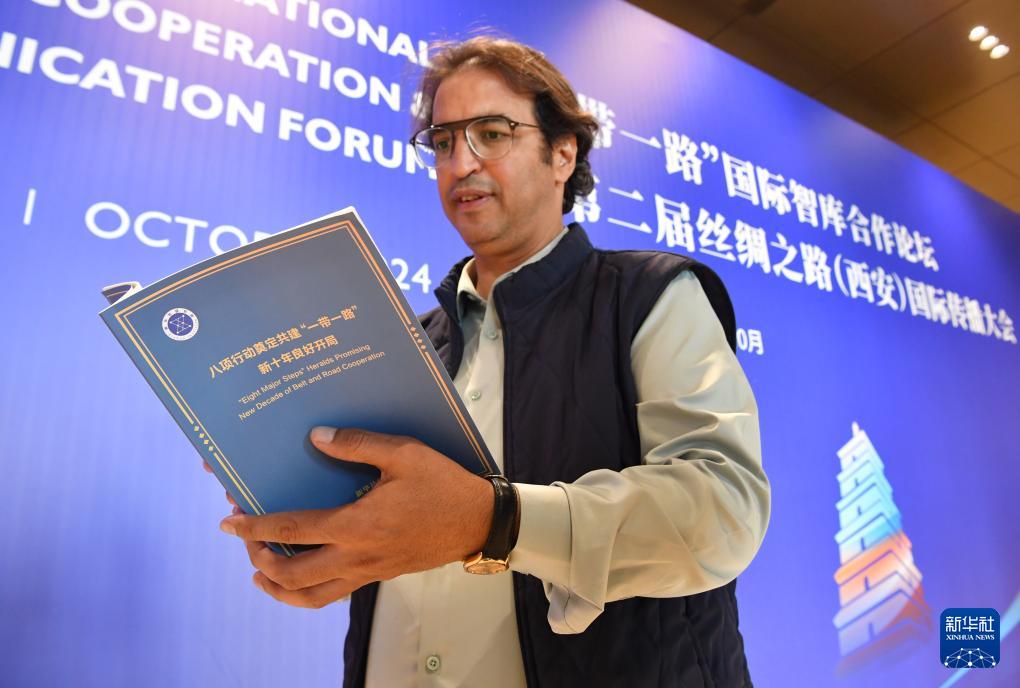當日,在“一帶一路”國際智庫合作論壇暨第二屆絲綢之路(西安)國際傳播大會上,新華社國家高端智庫發布了《八項行動奠定共建“一帶一路”新十年良好開局》智庫報告。新華社記者 邵瑞 攝