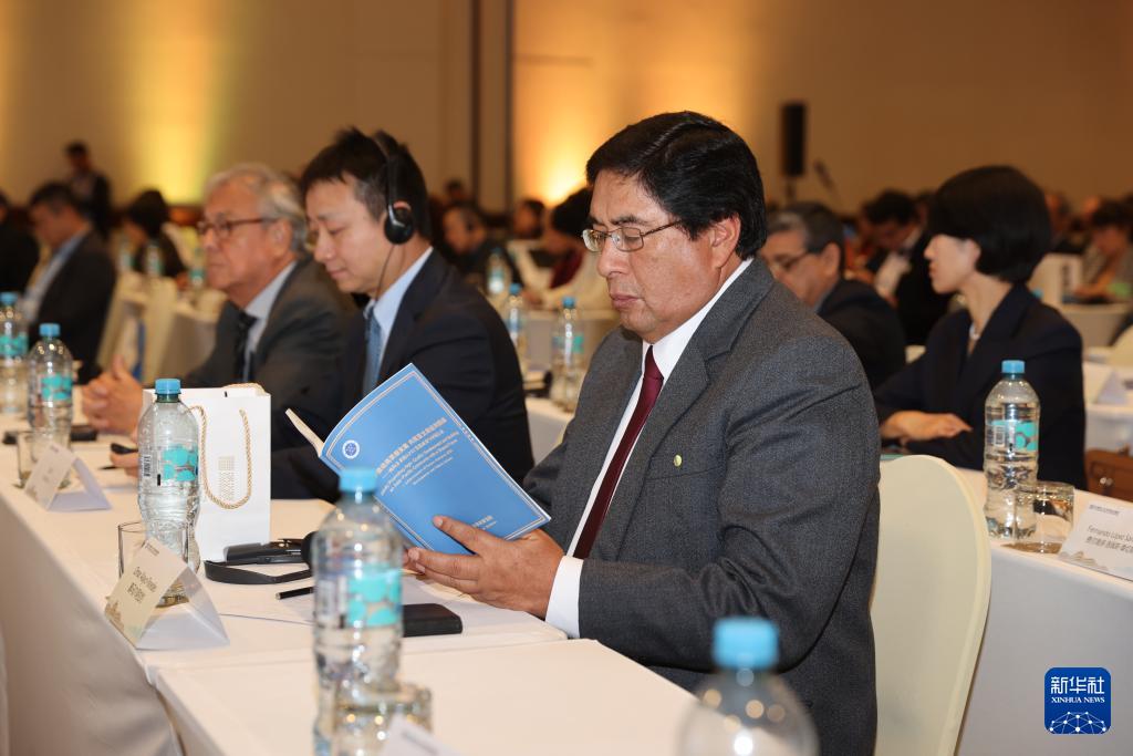 11月8日,在秘魯首都利馬,嘉賓翻閱智庫報告。新華社記者 李夢馨 攝