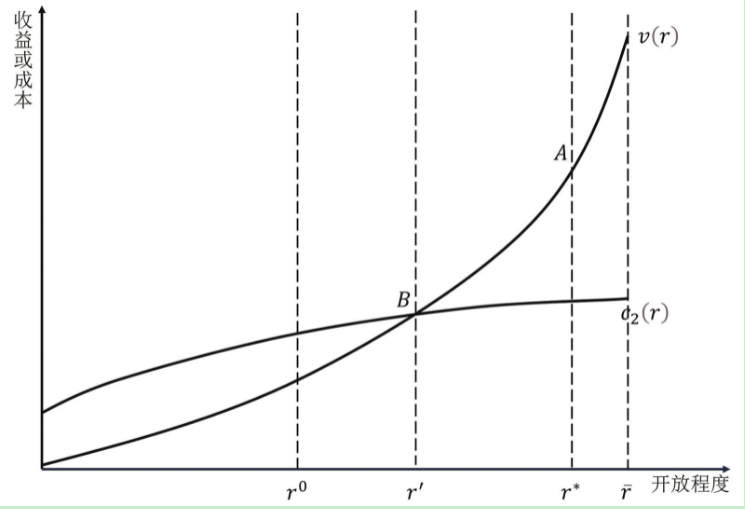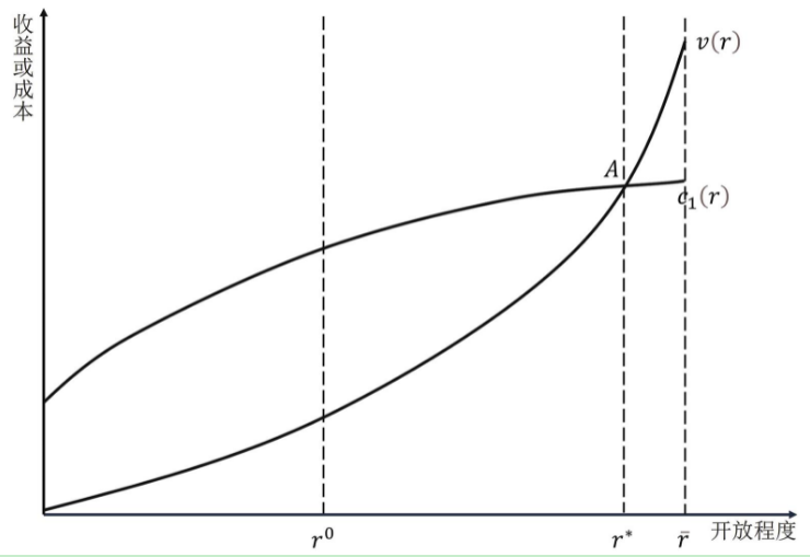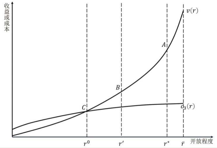 通過簡單的成本收益模型,可以解釋當前公共數據開放程度不足的原因。假設公共數據開放的社會收益為υ(r),成本為с(r),其中,r為公共數據的開放程度, 為因安全和隱私限制所能達到的開放上限。