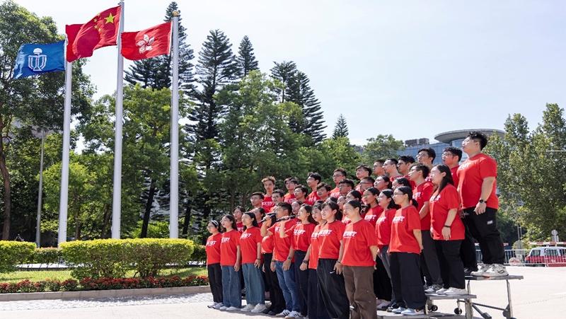 10月1日,香港科技大學師生在升旗儀式后齊聲高唱《我和我的祖國》。圖為部分學生領唱。新華社發(受訪者供圖)